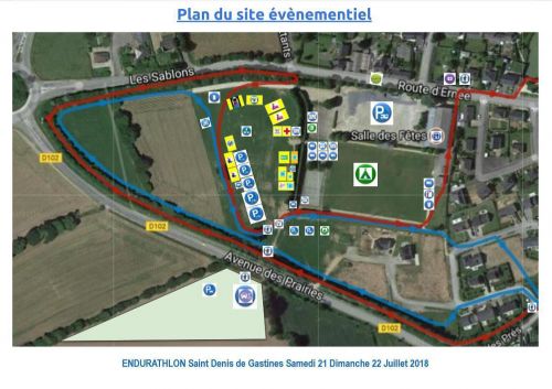 Voici un plan de l'implantation du site événementiel, avec les emplacements du camping, des parkings, de la zone de passage des relais, etc...